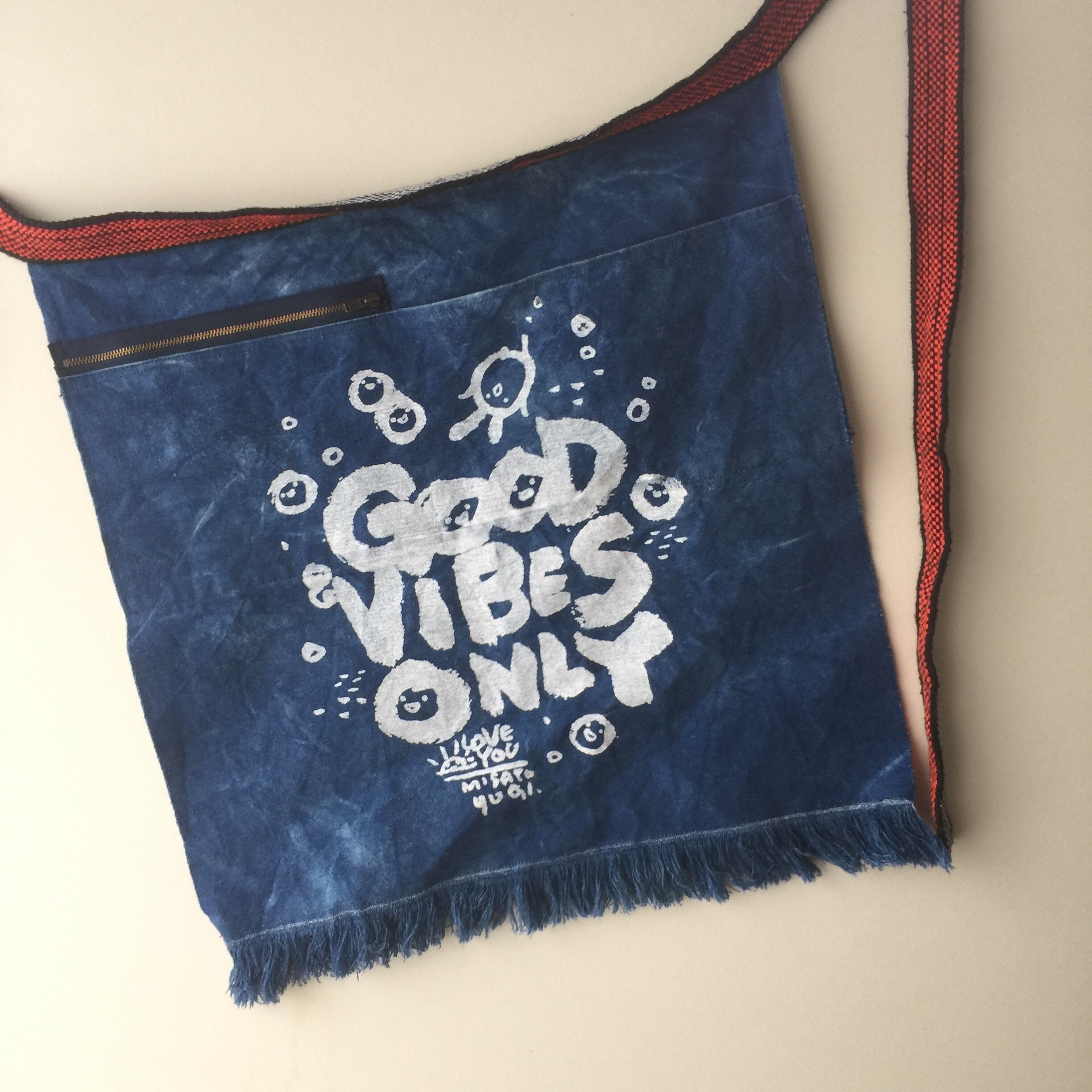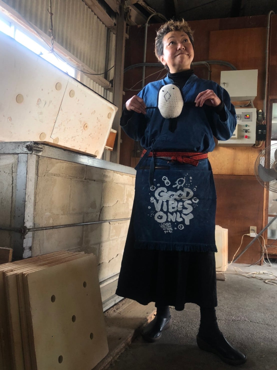 ボンド&ジャスティス代表の大土氏自ら奄美大島に渡り藍で染めています。染色した製品は大土氏とともに東北は宮城の女性たちによる工房(※)へ到着、ポケット付け&きゅうりちゃんプリントされます。