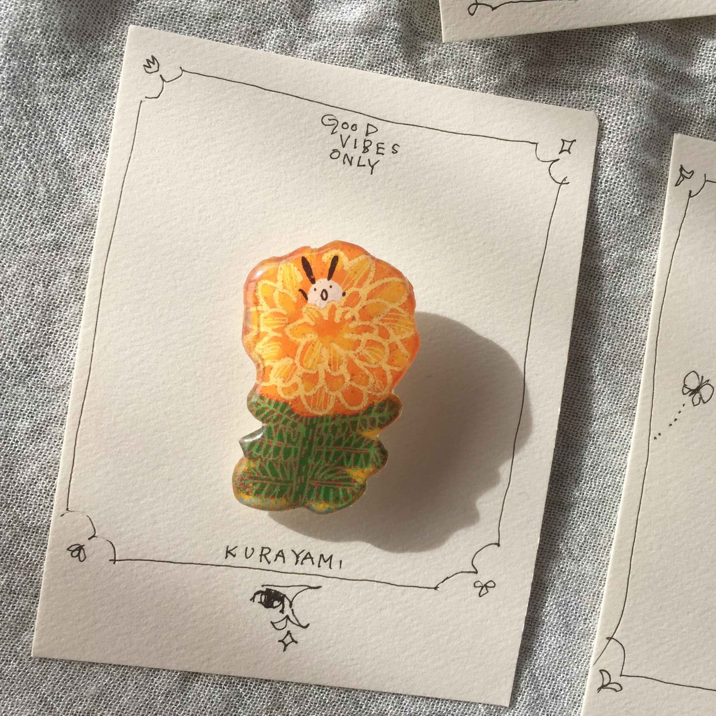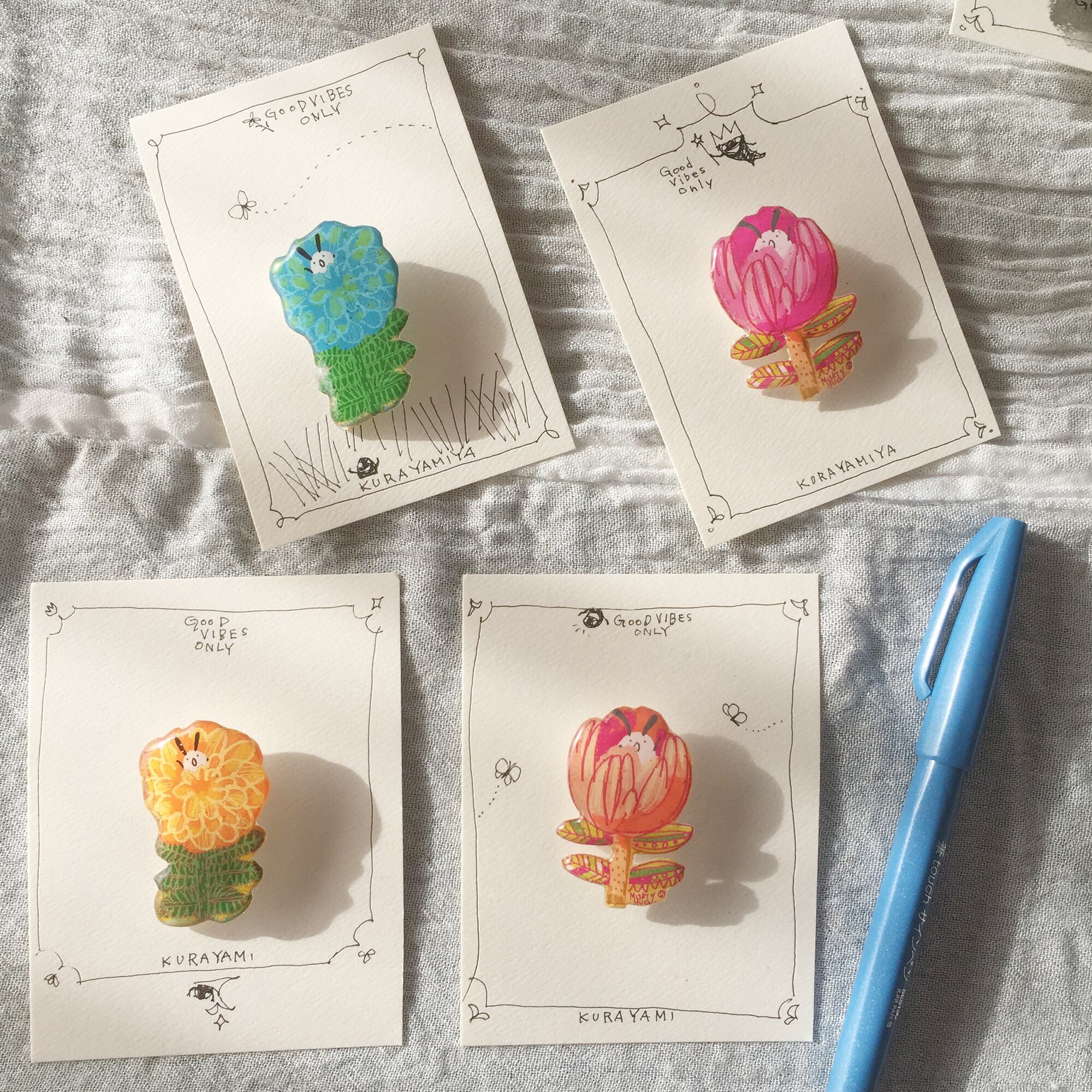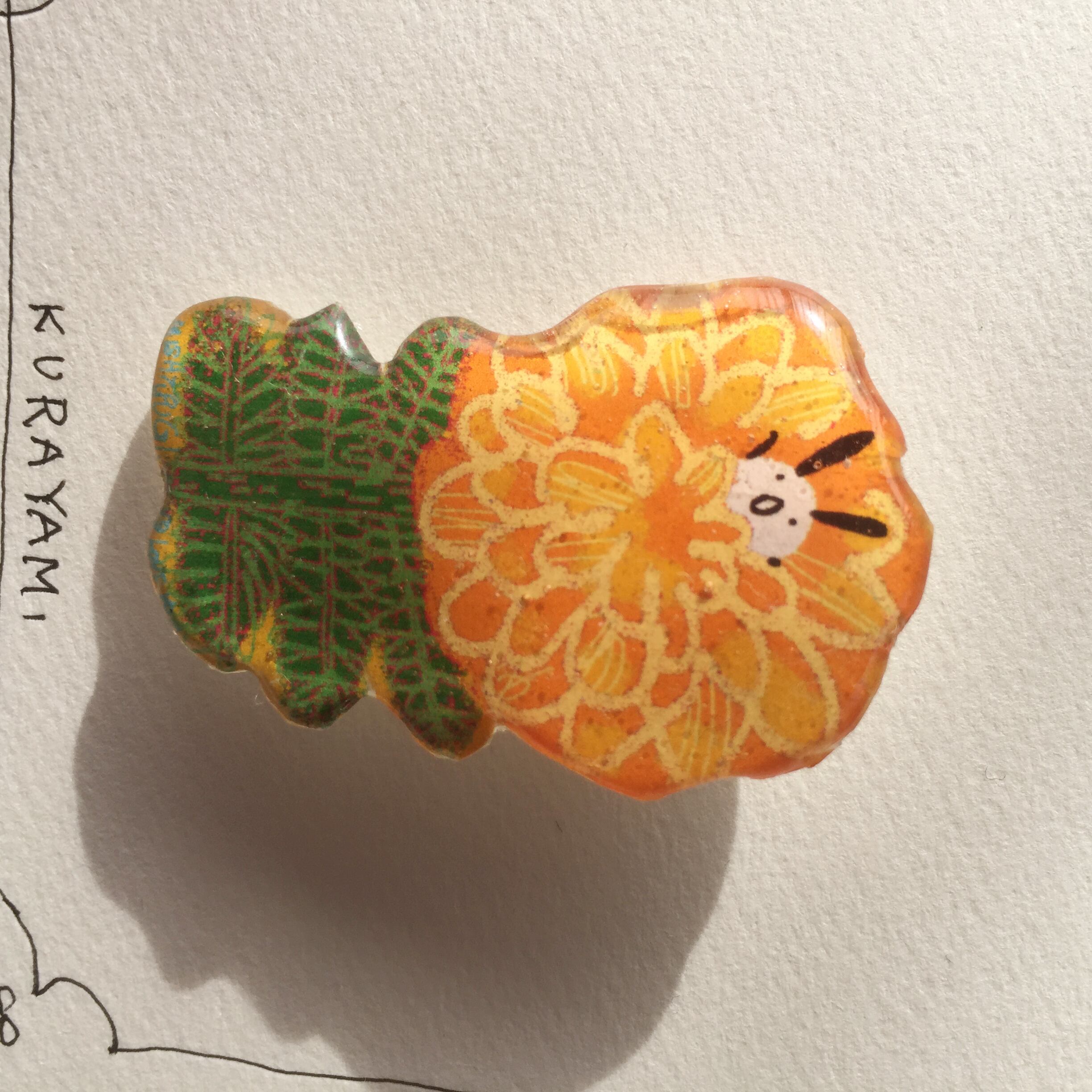 パソコンで描いたイラストを顔料インクで紙にプリント。手描きで微調整してから、レジンを塗ってぷっくりつやつやに仕上げました。商品到着までのんびりだいたい10日ほどかかります。価格はなんと送料込み。普通郵便などでポストに届きます。