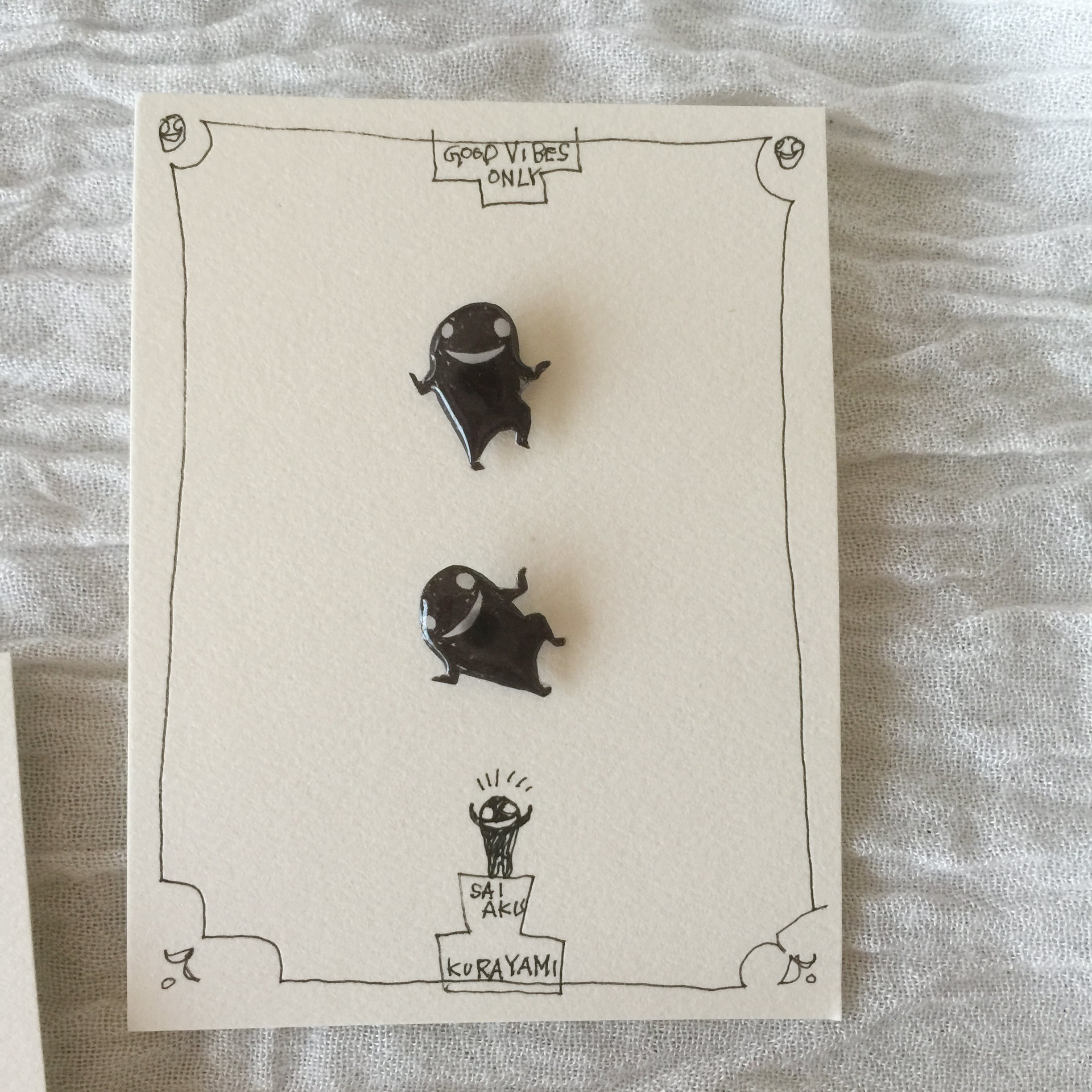 パソコンで描いたイラストを顔料インクで紙にプリント。手描きで微調整してから、レジンを塗ってぷっくりつやつやに仕上げます。注文を受けてからつくり始めますので、商品到着までのんびりだいたい10日ほどかかります。価格はなんと送料込み。普通郵便などでポストに届きます。